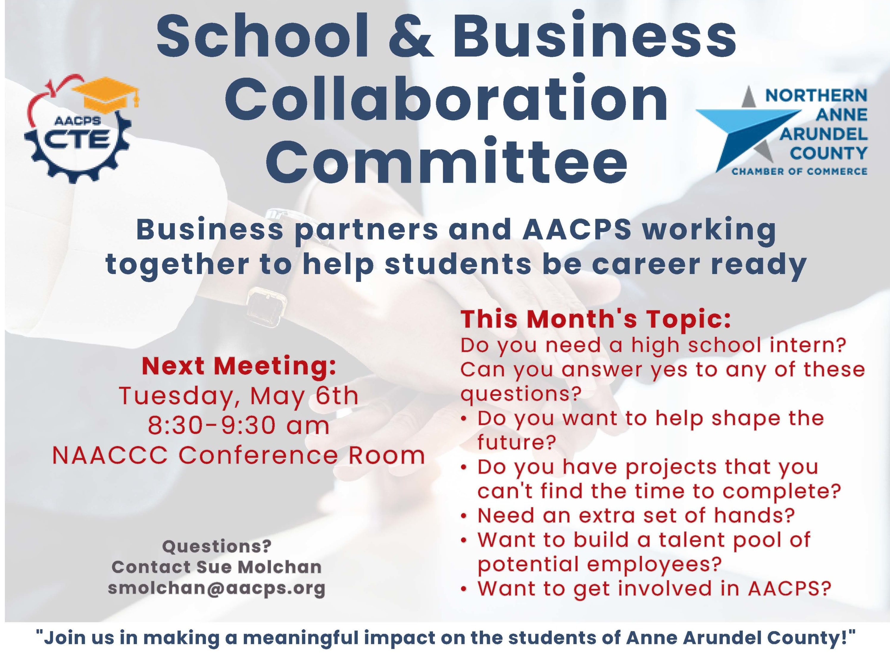 Join us at NAACCC, for the next Anne Arundel County Public School & Business Collaboration Meeting. Tuesday May 6th, 8:30am to 9:30am. Our topic will be Do you need a high school intern? Can you answer yes to any of these questions? • Do you want to help shape the future? • Do you have projects that you can't find the time to complete? • Need an extra set of hands? • Want to build a talent pool of potential employees? • Want to get involved in AACPS?Images